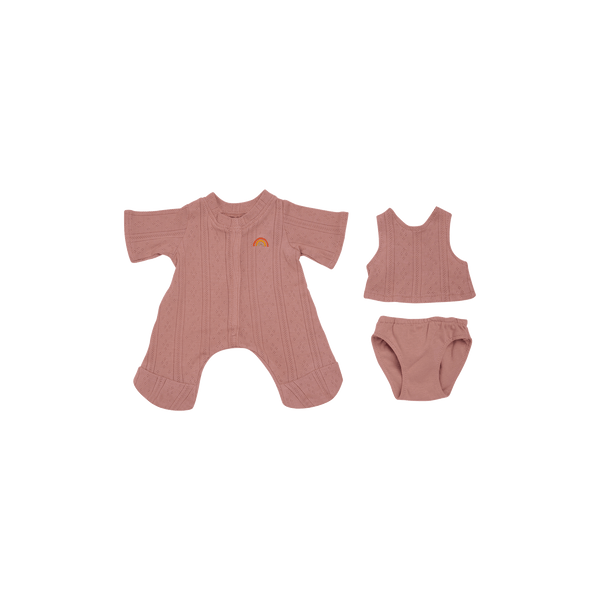 Pretty in pink and ready for bed. The Dinkum Doll PJs in Rose are soft, sweet, and oh-so-snuggly - perfect for playtime wind-downs and dreamy nights. This three-piece set features delicate pointelle pyjamas, a vest, and teeny-tiny undies, all in a rosy hue made for dollhouse daydreams. Slip your Dinkum into this bedtime look and let the snoozing begin!