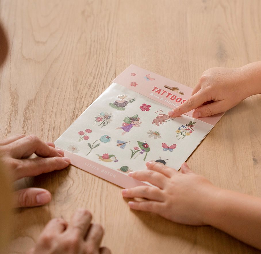 A set of cheerful tattoos 'Rosa & Friends' from Little Dutch. The colorful set consists of cute temporary children's tattoos of Rosa and her friends. Press the tattoos firmly onto the skin, dab with a wet cloth, wait a moment, and voilà!