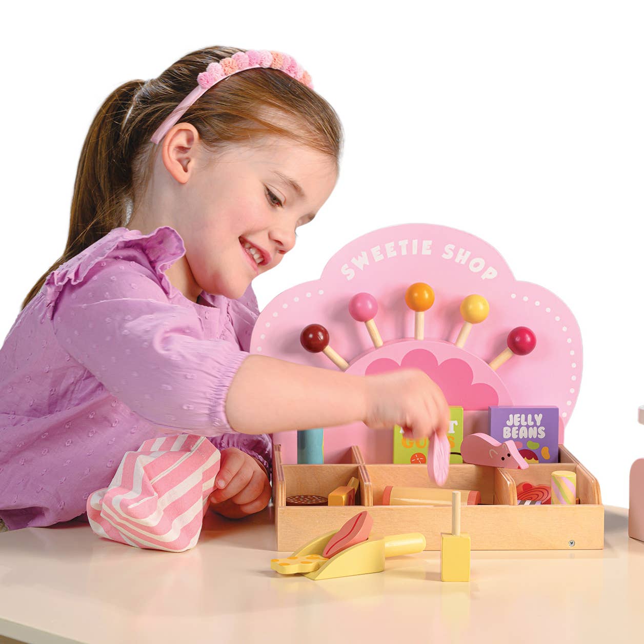 Become a sweet shop owner and welcome customers into your delightful retrostyle sweetie shop! Pic 'n' Mix candies, gummies, lollipops, penny chews and chocolate bars arranged in compartments or along the decorative shelf. Select with the scoop, pop them on the weighing scale and present in the pink striped fabric bag for your happy customer. Includes 2 printable sweetie cones to cut out and make up for extra play.